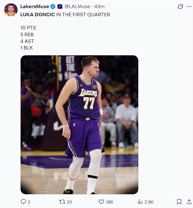 第三节湖人是多点开花,詹姆斯连拿7分,里夫斯也命中三分,东契奇这一节6中2+罚球4中4拿到8分5篮板3助攻,三节打完东契奇27分14篮板8助攻,湖人也从落后7分到反超3分。里夫斯三节12中3。