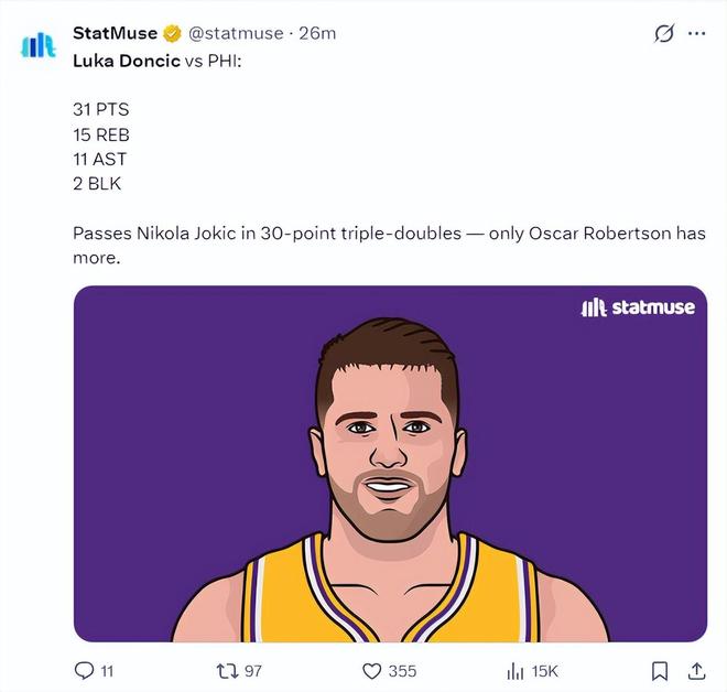 2.生涯第49次30+三双超越约基奇、威少独享历史第二;